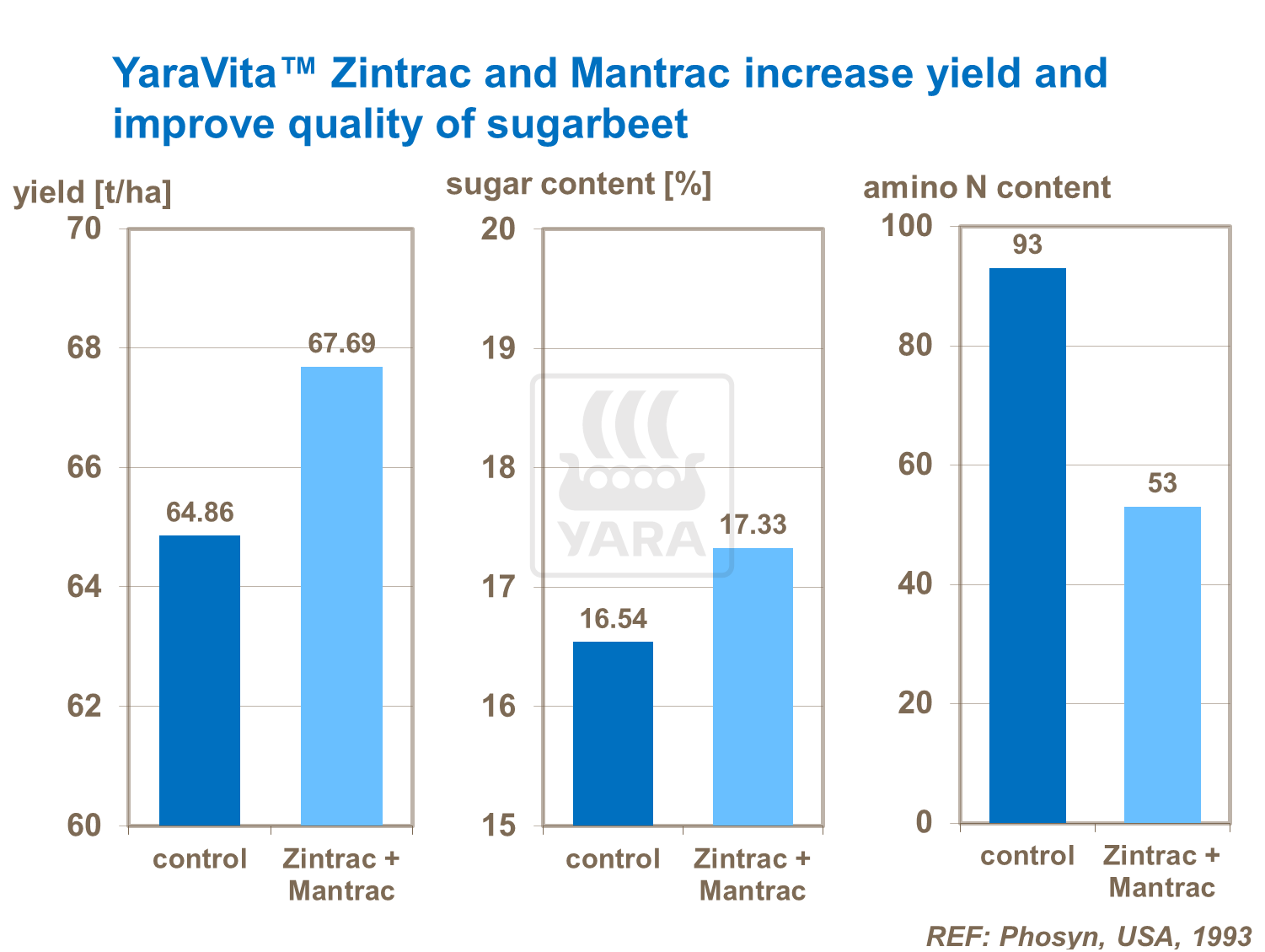 Mangan ma wpływ na syntezę chlorofilu, fotosyntezę, oddychanie i aktywację enzymów takich jak enzymy tłuszczowe. Jest składnikiem rybosomów, ogrywa również kluczową rolę w syntezie protein, wspomaga wykorzystanie azotu w roślinie. Pobranie Mn przez buraki cukrowe wynosi około 350g/ha. Odpowiedni poziom zawartości w liściach wynosi 0,92-1,85 mg/kg świeżej masy.