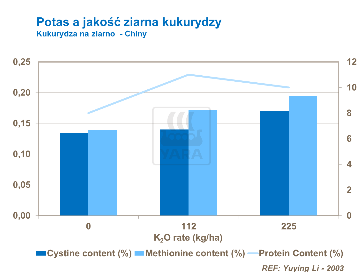 Odpowiednie odżywienie potasem powoduje wzrost zawartości białka w ziarnie a także zawartości aminokwasów cystyny i metioniny.