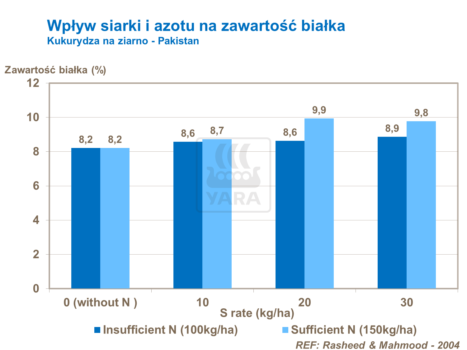 Niska dostępność azotu w czasie nalewania ziarna prowadzi do obniżenia zawartości białka. Zrównoważone nawożenie, w tym jego udział w nawożeniu pogłównym, zwiększa zawartość protein zapewniając jednocześnie niezbędną ilość składnika do wypełniania ziaren kukurydzy.