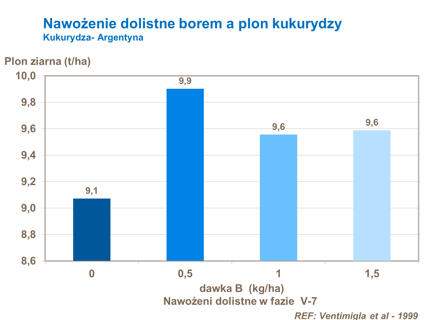 Bor bierze udział we wzroście komórek, wzroście łagiewki przez co bezpośrednio wpływa na ilość zawiązanych ziaren. Niedobór boru może powodować zmniejszenie liczby ziaren w kolbie, uwidacznia się poprzez „puste” miejsca na kolbie, gdzie nie zawiązały się ziarna. Nawożenie dolgebowe borem lub dolisnte podczas wzrostu wydłużeniowego roślin (V5-V7) może spowodować zwiększenie plonu ziarna kukurydzy.