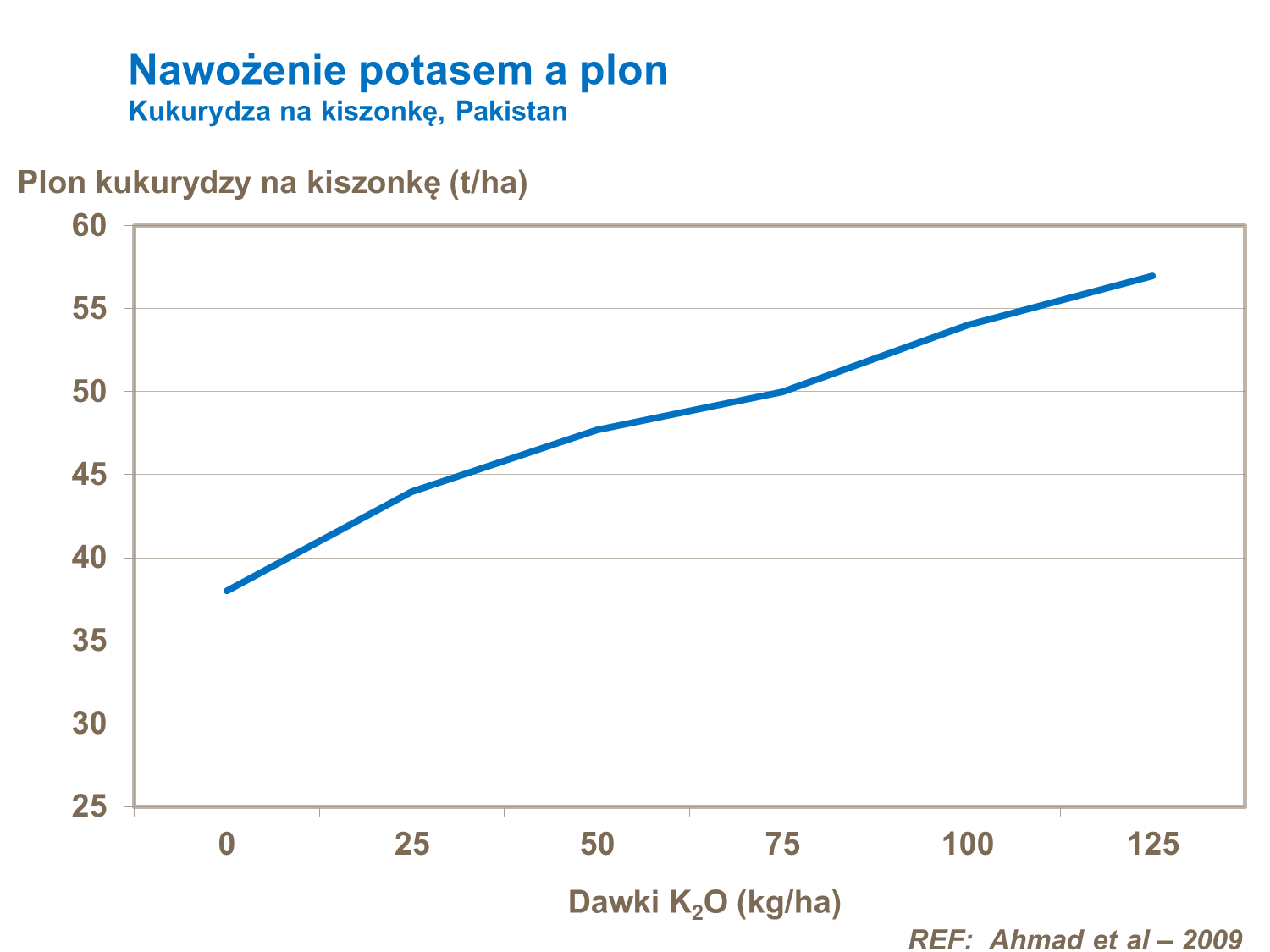 Krzywe zależności pomiędzy nawożeniem potasem a plonem kukurydzy wykazują jednoznacznie olbrzymi wpływ tego składnika na plon roślin. Najczęściej stosowana dawka tego składnika waha się w przedziale od 100-200kg K2O/ha. Kukurydza ma podobne zapotrzebowanie na potas jak na azot. Przy niskich dawkach azotu rośliny pobierają również mniej potasu, co powoduje spadek plonu. Niedobór potasu i fosforu może powodować zmniejszenie liczy ziaren na wierzchołku kolby.