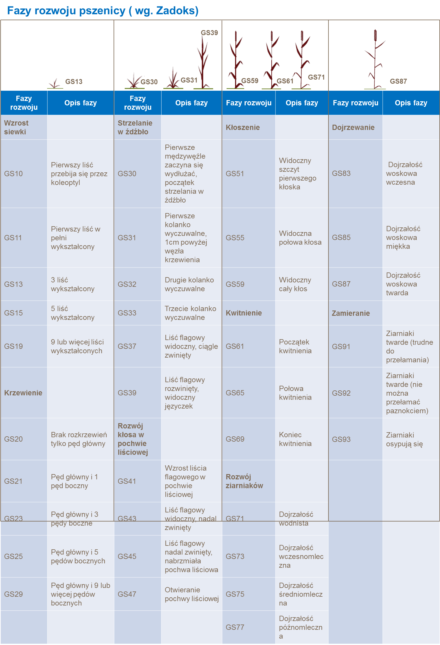 Rozwój pszenicy może zostać opisany za pomocą kilku różnych skal, które zostały opracowane na przestrzeni lat. Zazwyczja używane są: wg Zadoksa, Feekesa i Hauna, gdzie ta wg Zadoksa jest najczęściej używaną przy podejmowaniu decyzji agronomicznych. Poniżej przedstawiono szczegóły: