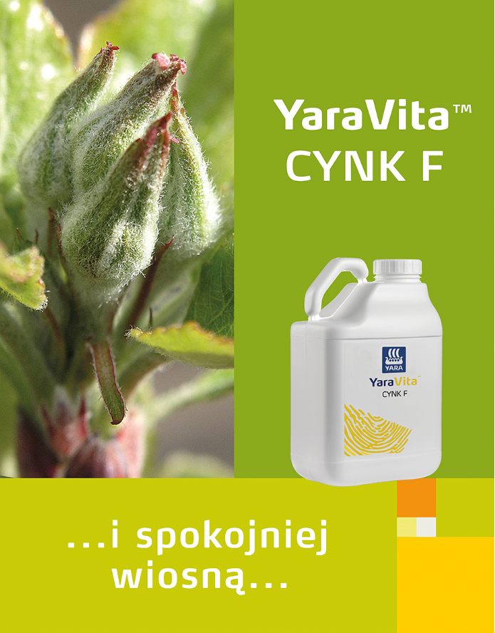 Proponujemy tutaj zastosowanie dwóch nawozów dolistnych w odpowiednich terminach. Pierwszy z nich to zawiesinowy produkt dolistny: YaraVita Cynk F w dawce 1 l/ha, zastosowany w fazie od pękania pąków do wyrzucania kwiatostanów. Zabieg dolistny tym produktem ma za zadnie wprowadzenie i utrzymanie jak najdłużej na organach roślin Cynku. Cynk jest mikroelementem, który spełnia wiele funkcji w roślinie, jedną z nich jest utrzymanie integralności membran komórkowych oraz wpływ na wysycenie ich nienasyconymi kwasami tłuszczowymi. Im większe wysycenie wspomnianymi kwasami, tym stabilność i odporność błon komórkowych są wyższe na przechłodzenie komórek. Inaczej mówiąc przy dobrym zaopatrzeniu roślin w cynk, ich uszkodzenia na skutek przechłodzenia są mniejsze.