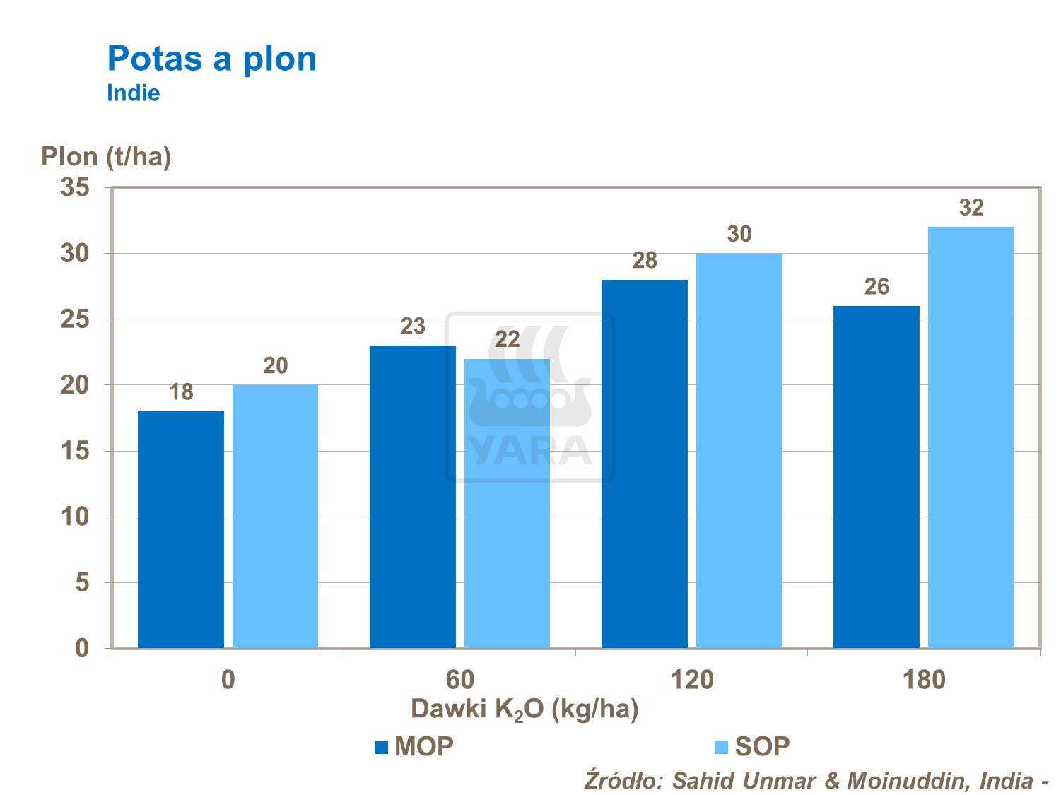 Badania z Indii wykazały, że potas wpływa na wzrost plonu ziemniaków, wskazując dodatkowo na bardziej plonotwórcze działanie siarczanu potasu (SOP) w stosunku do chlorku potasu (MOP).