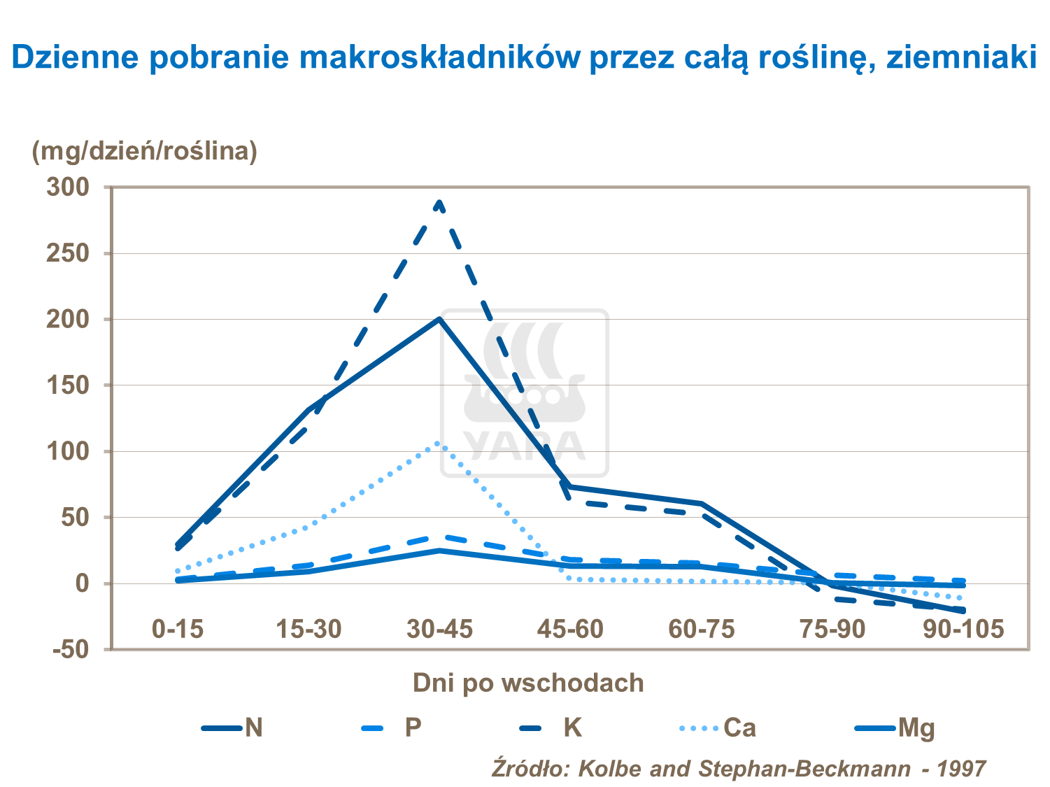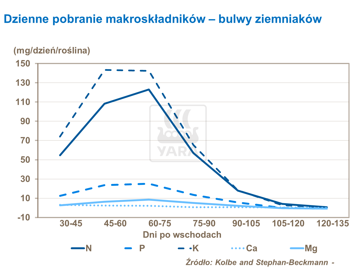Potas i azot są składnikami, które rośliny pobierają w największej ilości, aby wyprodukować wysoki plon bulw ziemniaka. Natomiast wymagania co do fosforu, wapnia i magnezu są nieco mniejsze. Należy jednak pamiętać, że istnieje duże zapotrzebowanie na te makroelementy w początkowych fazach wzrostu. Dlatego, aby osiągnąć plon optymalny, istotne jest, aby dostarczyć roślinie takie ilości składników pokarmowych, aby zaspokoić jej zapotrzebowanie w danych fazach rozwoju.